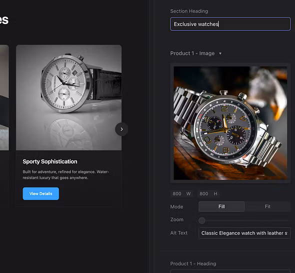 Find or create the page you want your AI created section on. Choose to create a new Intelligent chapter and simply describe what you want to present. Example: “I want to show a gallery of six product images with short captions in a 3-column layout.”