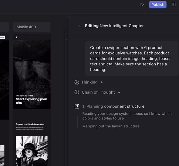 Strife Intelligence use AI to build a new, fully functional page section including structure, styling, and placeholder content. The AI output is based on your site's existing design system and component guidelines. It’s tailored, not generic.